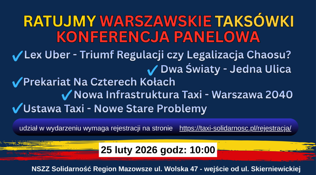 25 lutego 2026 r. w siedzibie NSZZ „Solidarność” Regionu Mazowsze w Warszawie ulica Wolska 47 wejście od ulicy Skierniewickiej odbędzie się konferencja panelowa poświęcona przyszłości rynku taxi i transportu osób, organizowana przez NSZZ Solidarność Region Mazowsze, NSZZ Solidarność Taksówkarzy Zawodowych oraz NSZZ Solidarność – Krajowy Sekretariat Transportowców, we współpracy z Mazowiecką Wspólnotą Samorządową i Europejską Federacją Transportu (ETF).